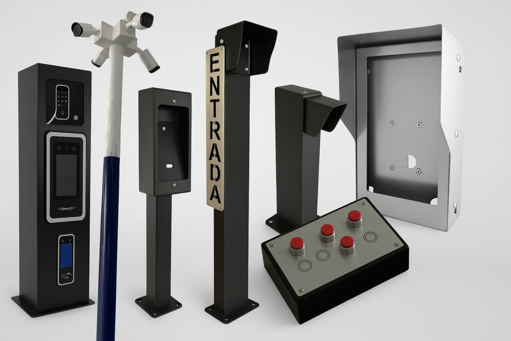 Desenvolvemos e fabricamos estruturas e componentes metálicos que organizam, protegem e valorizam seus sistemas de segurança eletrônica, controle de acesso e automação: